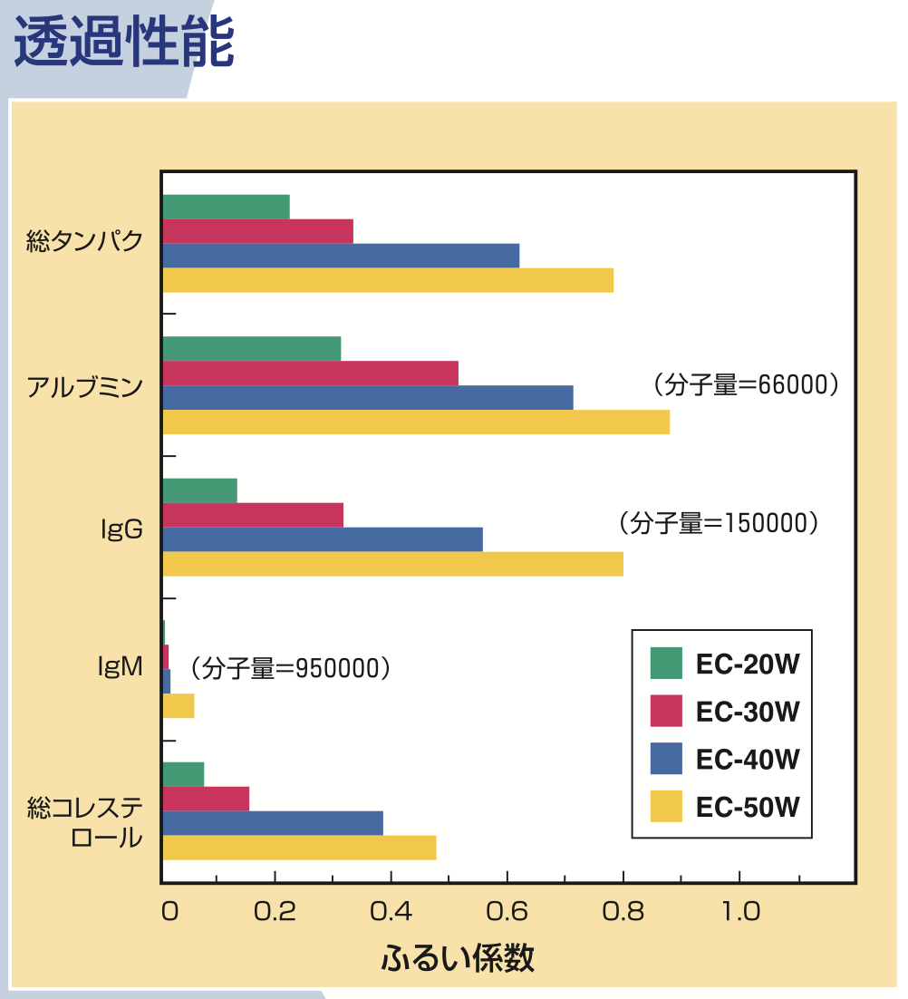 IgGにおいては、例えばEC-20Wでのふるい係数が0.15ということは阻止率(除去率)が0.85、EC-50Wでのふるい係数が0.80では阻止率(除去率)が0.20ということですので、EC-20WはIgGを除去できる2次膜、EC-50WはIgGはあまり除去されずIgMがメインターゲットという2次膜になります