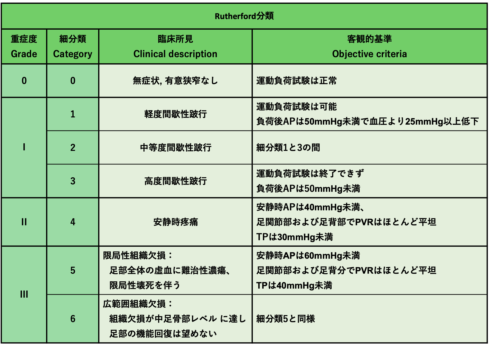 Rutherford分類には客観的評価に基づく虚血重症度の 数値が定義されていますので、Fontaine 分類の欠点を補っている分類となっており、間歇性跛行や組織欠損例についてもより詳細に分類されています。