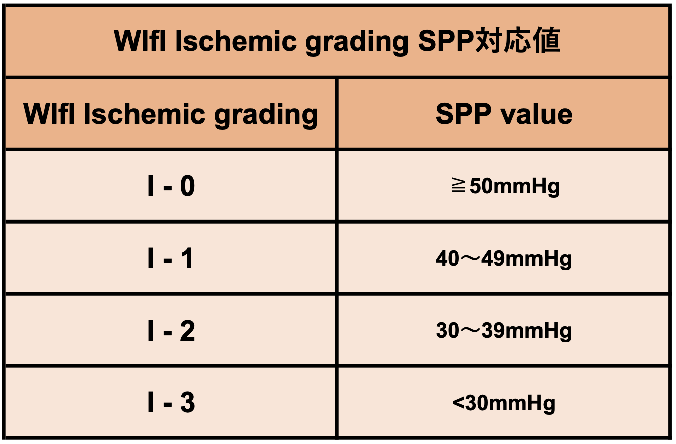 そのため、『末梢閉塞性動脈疾患の治療ガイドライン』では、SPPに関するエビデンスを集積して、WIfI Ischemic gradingに対するSSP値が提唱されています。合わせて提示させていただきます。