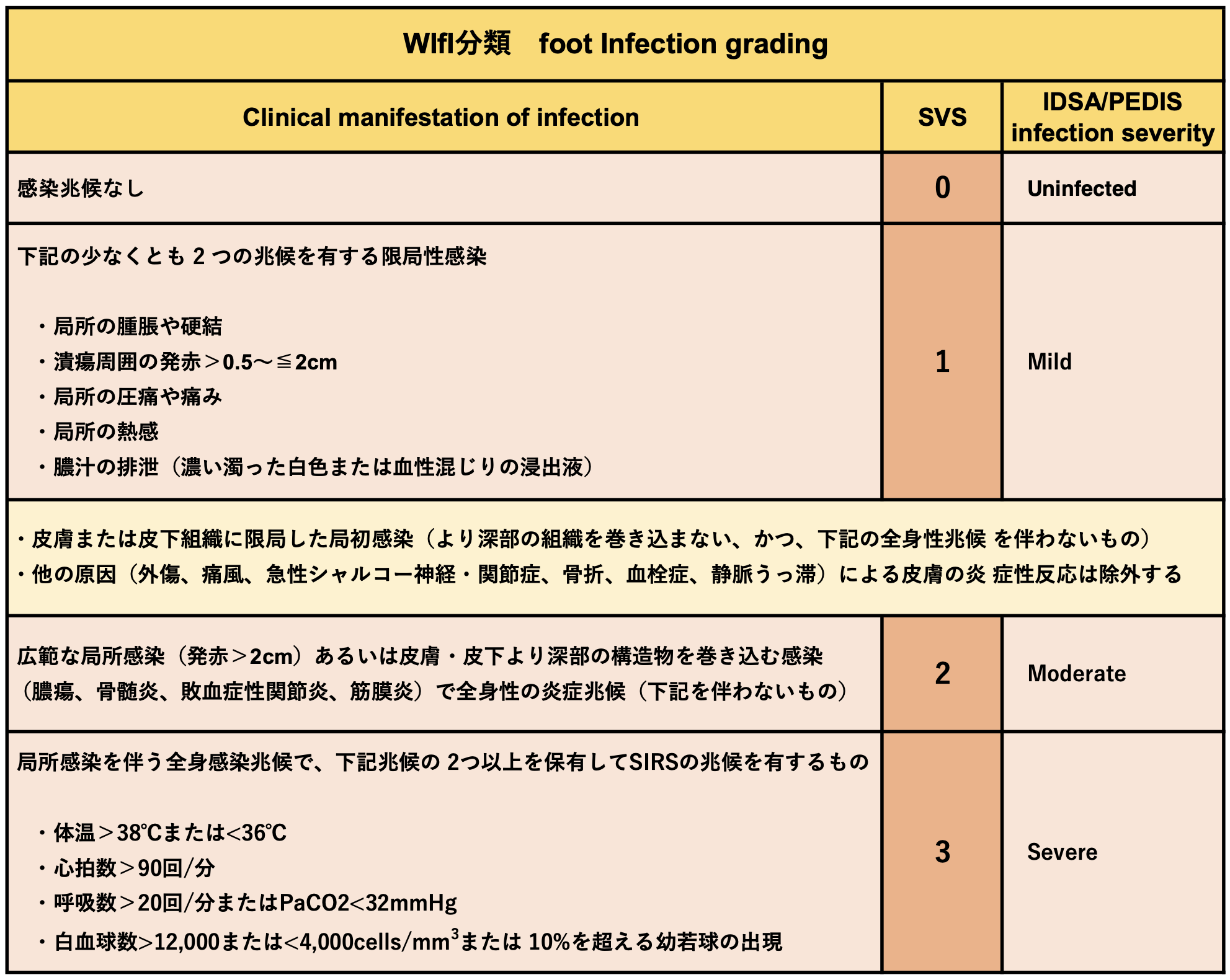 SVS WIfI分類は、アメリカ血管外科学会(SVS:society for vascular surgery)が2014年に提唱された下肢予後推定と至適治療方針を”組織欠損(wound)“、”虚血(ischemia)“、”足部感染(foot infection)“の3つの観点から評価するためのスケールです。