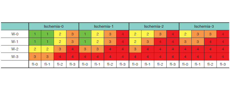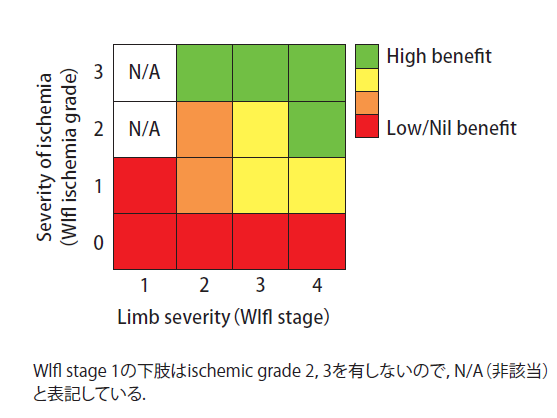 虚血重症度と血行再建の有効性に関して、大切断のリスクと必ずしも一致しているわけではないため、大切断のリスクとは別に血行再建の有効性の有無がWIfI stageとischemic gradeで層別化されています。